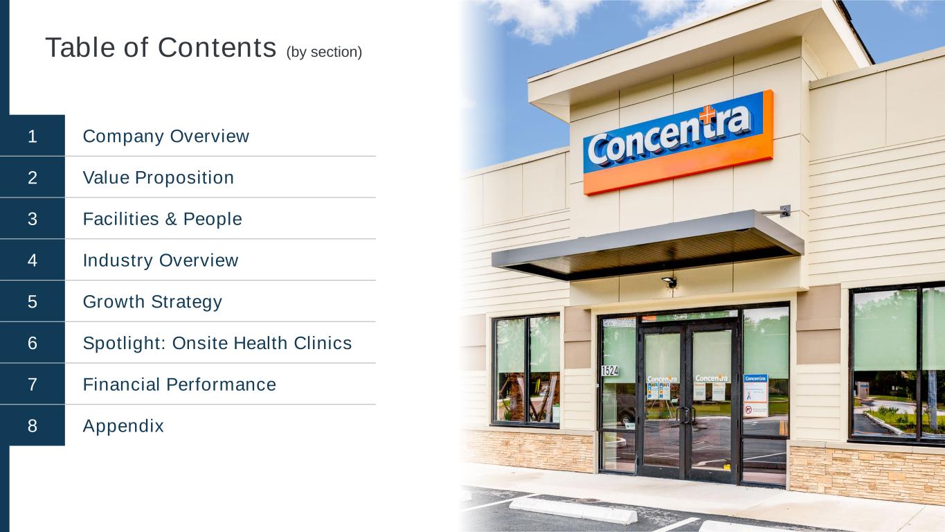 5 Table of Contents (by page number) 1 Investor Book 19 Value Proposition 37 Growth Strategy 2 Mission Statement 20 Differentiated Value Proposition 38 Growth Levers 3 Disclaimer 21 Strong Clinical Outcomes and ROI 39 Growth Algorithm 4 Table of Contents (Overview) 22 Operational Excellence & Patient Experience 40 Acquisitions & De Novos 5 Table of Contents (Detail) 23 Technology & Innovation 41 Case Study 6 Company Overview 24 Facilities & People 42 Sales & Marketing 7 Concentra At-a-Glance 25 Facility Design 43 Spotlight: Onsite Health Clinics 8 Investment Highlights 26 Staffing 44 Onsite Segment Overview 9 Company History 27 Supporting Infrastructure 45 Onsite Industry Overview 10 Geographic Footprint 28 Industry Overview 46 Onsite Growth 11 Access Points / Channels 29 Industry Drivers 47 Onsite Competitive Landscape 12 Service Offering 30 Workforce Needs and Challenges 48 Financial Performance 13 Diversification 31 Costs of Work-Related Injuries 49 Financial Highlights 14 Customers & Relationships 32 Work Comp 101: Ecosystem Overview 50 Long-Term Financial Targets 15 Financial Performance & Growth 33 Work Comp 101: Direction of Care 51 Free Cash Flow & ROIC 16 Labor Costs 34 Work Comp 101: Reimbursement 52 Balance Sheet & Capital Allocation 17 Economic Resiliency 35 Work Comp 101: Rate Updates & Increases 53 Financial Summary (2023-2025) 18 Leadership Team 36 Competitive Landscape 54 Appendix