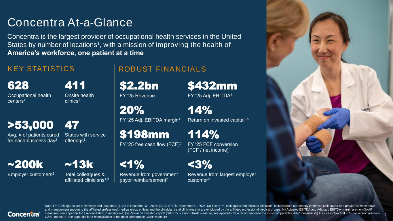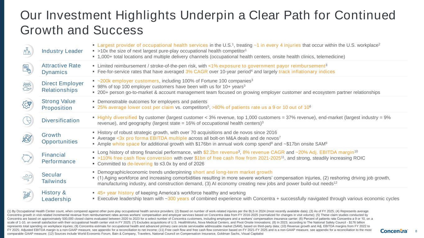 ©2026 Concentra Inc. All rights reserved. Concentra At-a-Glance Concentra is the largest provider of occupational health services in the United States by number of locations1, with a mission of improving the health of America’s workforce, one patient at a time KEY STATISTICS ~13k Total colleagues & affiliated clinicians1,3 ~200k Employer customers2 47 States with service offerings1 >53,000 Avg. # of patients cared for each business day2 ROBUST FINANCIALS $2.2bn FY ‘25 Revenue $432mm FY ‘25 Adj. EBITDA4 411 Onsite health clinics1 628 Occupational health centers1 <1% Revenue from government payor reimbursement2 <3% Revenue from largest employer customer2 Note: FY 2025 figures are preliminary and unaudited; (1) As of December 31, 2025; (2) As of TTM December 31, 2025; (3) The term "colleagues and affiliated clinicians" includes both our directly employed colleagues who provide administrative and management support to the affiliated professional medical group entities and the physicians and clinicians that are employed by the affiliated professional medical groups; (4) Adjusted EBITDA and Adjusted EBITDA margin are non-GAAP measures, see appendix for a reconciliation to net income; (5) Return on invested capital ("ROIC") is a non-GAAP measure, see appendix for a reconciliation to the most comparable GAAP measure; (6) Free cash flow and FCF conversion are non- GAAP measure, see appendix for a reconciliation to the most comparable GAAP measure 7 20% FY ‘25 Adj. EBITDA margin4 14% Return on invested capital2,5 114% FY ‘25 FCF conversion (FCF / net income)6 $198mm FY ‘25 free cash flow (FCF)6