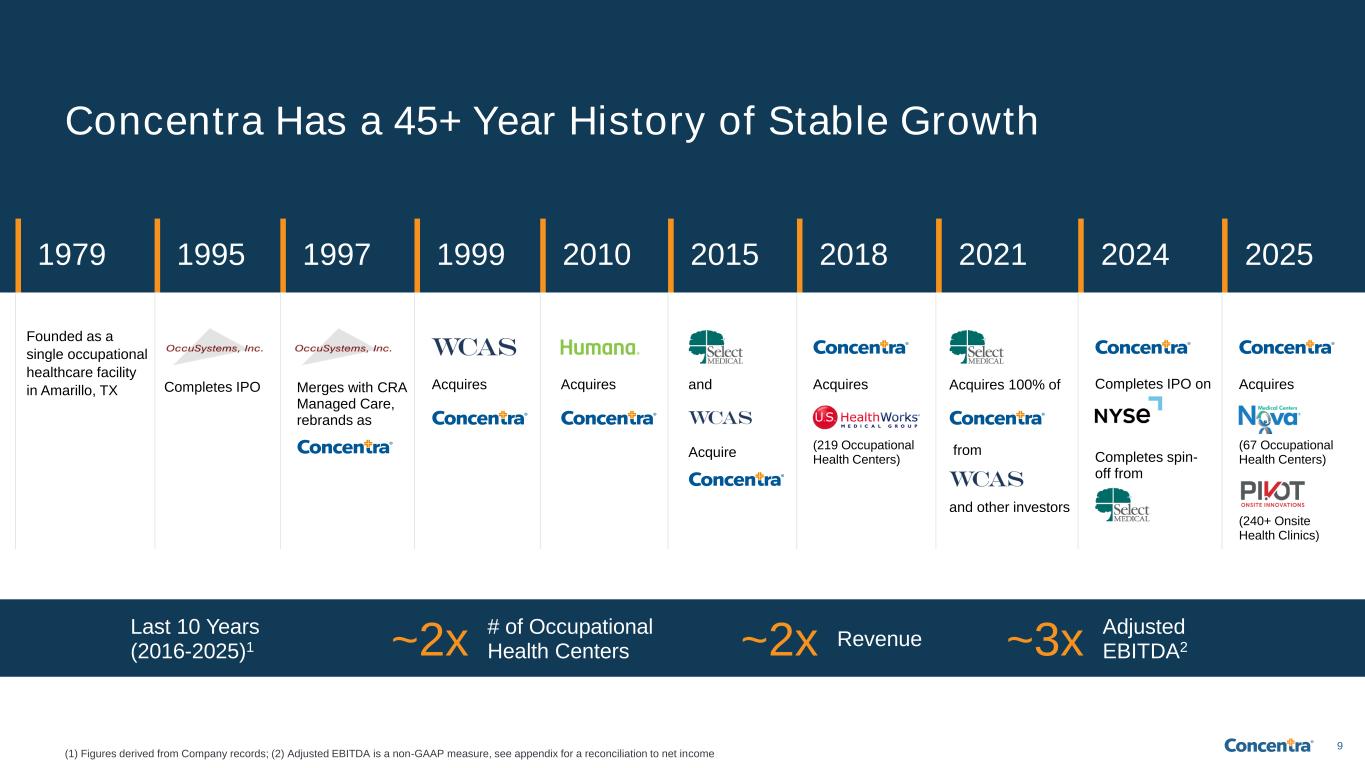 8 Our Investment Highlights Underpin a Clear Path for Continued Growth and Success (1) By Occupational Health Center count, when compared against other pure-play occupational health service providers; (2) Based on number of work-related injuries per the BLS in 2024 (most recently available data); (3) As of FY 2025; (4) Represents average Concentra growth in visit-related incremental revenue from reimbursement rates across workers’ compensation and employer services based on Concentra data from FY 2016-2025 (normalized for changes in visit volume); (5) These claim studies conducted by Concentra are based on approximately 500,000 closed claims evaluated between 2020 to 2023 for a select number of Concentra customers, including employers and a workers’ compensation insurance carrier; (6) Percent of patients rate Concentra a 9 or 10, on a scale of 1-10, on overall satisfaction with their occupational health center visit in FY 2025; (7) Excludes acquisitions of U.S. HealthWorks, Nova Medical Centers, and Pivot Onsite Innovations; (8) In 2023, according to The National Safety Council - $176 billion represents total spending on workplace injuries; (9) Concentra estimate for occupational health and advanced primary care onsite serviceable addressable market (SAM), based on third-party data; (10) Revenue growth and Adj. EBITDA margins from FY 2022 to FY 2025; Adjusted EBITDA margin is a non-GAAP measure, see appendix for a reconciliation to net income; (11) Free cash flow and free cash flow conversion based on FY 2021-FY 2025 and is a non-GAAP measure, see appendix for a reconciliation to the most comparable GAAP measure; (12) Sources include World Economic Forum, Bain & Company, Travelers, National Council on Compensation Insurance, Goldman Sachs, Visual Capitalist Industry Leader ▪ Largest provider of occupational health services in the U.S.1, treating ~1 in every 4 injuries that occur within the U.S. workplace2 ▪ >10x the size of next largest pure-play occupational health competitor1 ▪ 1,000+ total locations and multiple delivery channels (occupational health centers, onsite health clinics, telemedicine) Attractive Rate Dynamics ▪ Limited reimbursement / stroke-of-the-pen risk, with <1% exposure to government payor reimbursement3 ▪ Fee-for-service rates that have averaged 3% CAGR over 10-year period4 and largely track inflationary indices Direct Employer Relationships ▪ ~200k employer customers, including 100% of Fortune 100 companies3 ▪ 98% of top 100 employer customers have been with us for 10+ years3 ▪ 200+ person go-to-market & account management team focused on growing employer customer and ecosystem partner relationships Strong Value Proposition ▪ Demonstrable outcomes for employers and patients ▪ 25% average lower cost per claim vs. competitors5, >80% of patients rate us a 9 or 10 out of 106 Diversification ▪ Highly diversified by customer (largest customer < 3% revenue, top 1,000 customers = 37% revenue), end-market (largest industry = 9% revenue), and geography (largest state = 16% of occupational health centers)3 Growth Opportunities ▪ History of robust strategic growth, with over 70 acquisitions and de novos since 2016 ▪ Average <3x pro forma EBITDA multiple across all bolt-on M&A deals and de novos7 ▪ Ample white space for additional growth with $176bn in annual work comp spend8 and ~$17bn onsite SAM9 Financial Performance ▪ Long history of strong financial performance, with $2.2bn revenue3, 8% revenue CAGR and ~20% Adj. EBITDA margin10 ▪ >110% free cash flow conversion with over $1bn of free cash flow from 2021-202511, and strong, steadily increasing ROIC ▪ Committed to de-levering to ≤3.0x by end of 2026 Secular Tailwinds ▪ Demographic/economic trends underpinning short and long-term market growth ▪ (1) Aging workforce and increasing comorbidities resulting in more severe workers’ compensation injuries, (2) reshoring driving job growth, manufacturing industry, and construction demand, (3) AI economy creating new jobs and power build-out needs12 History & Leadership ▪ 45+ year history of keeping America’s workforce healthy and working ▪ Executive leadership team with ~300 years of combined experience with Concentra + successfully navigated through various economic cycles