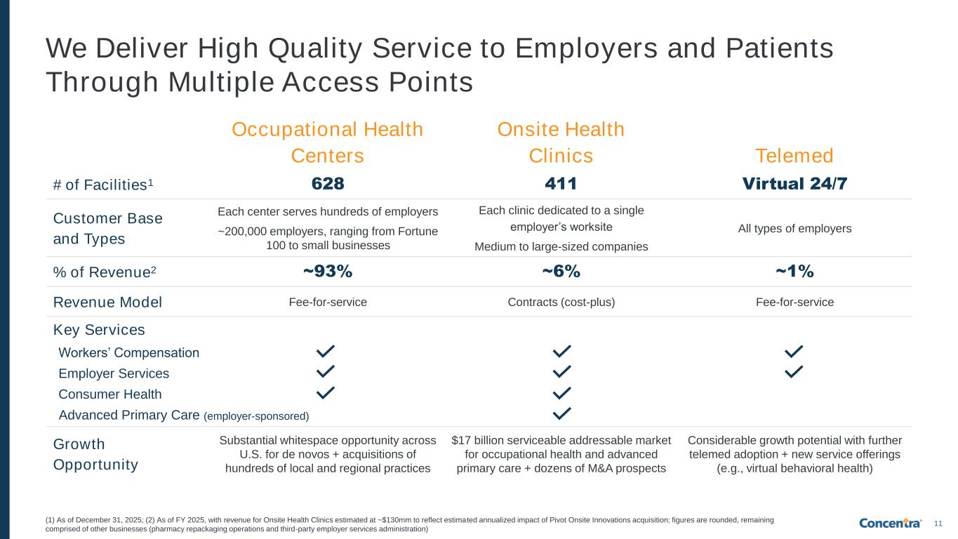 10 We Have Built an Extensive Footprint Across the U.S. Our broad geographic footprint serves ~200,000 employers and enables us to care for millions of employees 628 Occupational Health Centers 411 Onsite Health Clinics 64% 85% of U.S. employer locations are within ~12 miles of a Concentra occupational health center1 of 100 largest MSA’s in U.S. have a Concentra occupational health center2 (1) Based on data from Dun & Bradstreet as of December 31, 2023 (~21mm out of ~32mm total employer locations in the U.S.); (2) Based on United States Census Bureau data Note: Blue shading in map denotes 47 states with an occupational health center, an onsite health clinic, and/or Concentra Telemed offering