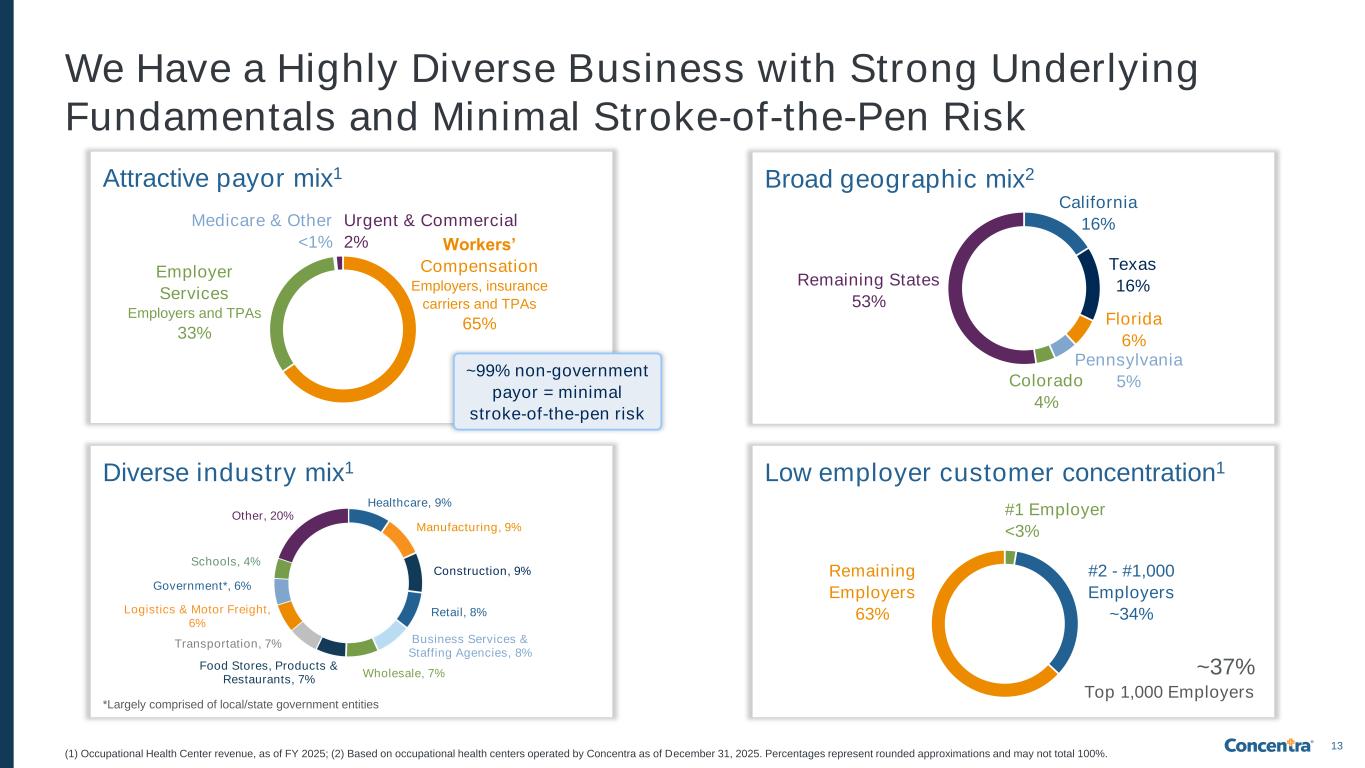 12 One-Stop Shop Service Offering & Full Continuum of Care Vision Testing Drug and alcohol screens Select Services Offered Lab services Immunizations Physical examinations Performance evaluations Physical examinations Other tests / screens Drug and alcohol screens (1) As of FY 2025 (remainder of visits is Consumer Health); (2) Occupational Health Center revenue as of FY 2025 (remainder of revenue is comprised of Consumer Health and other) Injury care Physical therapy* Specialty care* *Competitors often refer these services out Pharmacy* 65% of Revenue2 46% of Visits1 33% of Revenue2 52% of Visits1 Nature of Injuries Treated Lacerations / abrasionsSprains / strains Burns / wound careEye injuries FracturesExposures 72% of injuries are musculoskeletal-related1 Workers’ Compensation Services 24.4k Visits Per Day (“VPD”)1 $210 Revenue Per Visit (“RPV”)1 Pricing Model: Fee schedules/rates determined by each state, independent of state budgets and federal programs like Medicare or Medicaid Employer Services 27.9k Visits Per Day (“VPD”)1 $93 Revenue Per Visit (“RPV”)1 Pricing Model: Market-based pricing negotiated between provider and employer/ third-party administrator