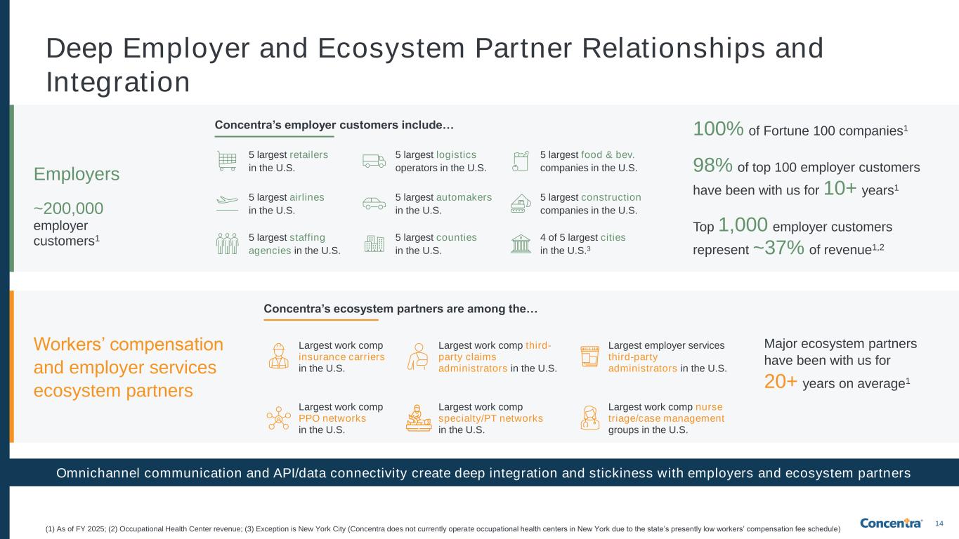 13 (1) Occupational Health Center revenue, TTM as of March 31, 2025; (2) Based on occupational health centers operated by Concentra as of March 31, 2025; (3) Excludes Nova occupational health centers. Percentages represent rounded approximations and may not total 100%. We Have a Highly Diverse Business with Strong Underlying Fundamentals and Minimal Stroke-of-the-Pen Risk (1) Occupational Health C nter revenue, as of FY 2025; (2) Based on occup tional he lth centers operated by Concentra as of December 31, 2025. Percentages represent rounded approximations and may not total 100%. Broad geographic mix2 Remaining States 53% California 16% Texas 16% Florida 6% Pennsylvania 5%Colorado 4% Attractive payor mix1 Employer Services Employers and TPAs 33% Medicare & Other <1% Workers’ Compensation Employers, insurance carriers and TPAs 65% Urgent & Commercial 2% Diverse industry mix1 Healthcare, 9% Manufacturing, 9% Construction, 9% Retail, 8% Business Services & Staffing Agencies, 8% Wholesale, 7% Food Stores, Products & Restaurants, 7% Transportation, 7% Logistics & Motor Freight, 6% Government*, 6% Schools, 4% Other, 20% Low employer customer concentration1 ~37% Top 1,000 Employers Remaining Employers 63% #2 - #1,000 Employers ~34% #1 Employer <3% *Largely comprised of local/state government entities ~99% non-government payor = minimal stroke-of-the-pen risk