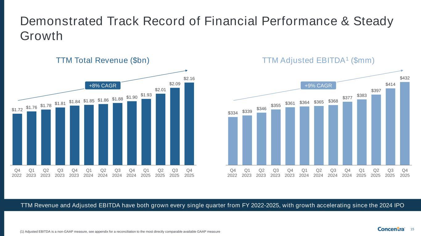 14 Employers Top 1,000 employer customers represent ~37% of revenue1,2 98% of top 100 employer customers have been with us for 10+ years1 100% of Fortune 100 companies1 Major ecosystem partners have been with us for 20+ years on average1 Workers’ compensation and employer services ecosystem partners (1) As of FY 2025; (2) Occupational Health Center revenue; (3) Exception is New York City (Concentra does not currently operate occupational health centers in New York due to the state’s presently low workers’ compensation fee schedule) Omnichannel communication and API/data connectivity create deep integration and stickiness with employers and ecosystem partners Deep Employer and Ecosystem Partner Relationships and Integration Concentra’s employer customers include… 5 largest logistics operators in the U.S. 5 largest automakers in the U.S. 5 largest counties in the U.S. 5 largest retailers in the U.S. 5 largest airlines in the U.S. 5 largest staffing agencies in the U.S. 5 largest food & bev. companies in the U.S. 5 largest construction companies in the U.S. 4 of 5 largest cities in the U.S.3 ~200,000 employer customers1 Concentra’s ecosystem partners are among the… Largest work comp insurance carriers in the U.S. Largest work comp third- party claims administrators in the U.S. Largest employer services third-party administrators in the U.S. Largest work comp PPO networks in the U.S. Largest work comp specialty/PT networks in the U.S. Largest work comp nurse triage/case management groups in the U.S.