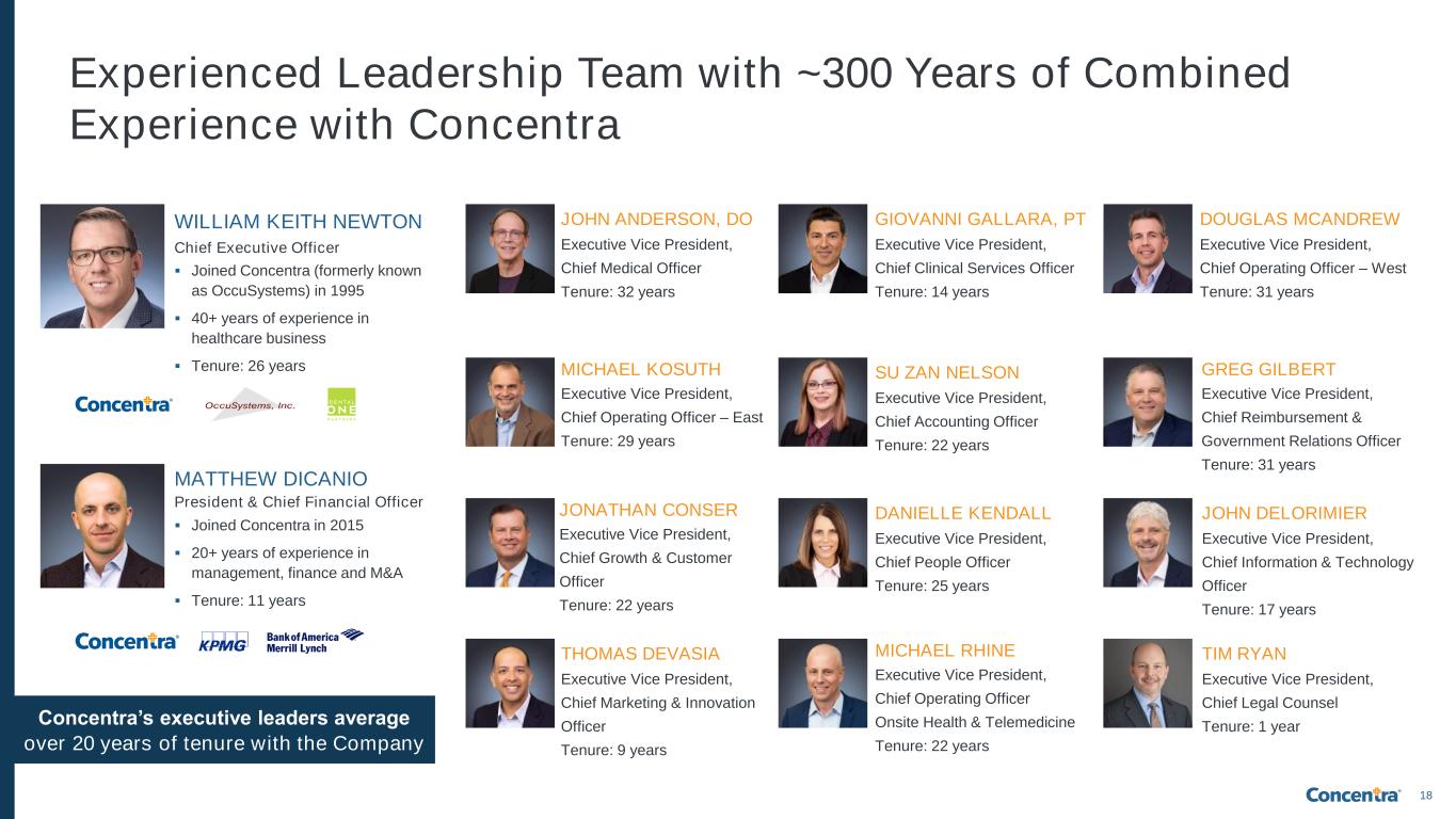 17 COVID-19 Pandemic Global Financial Crisis (GFC) $75 $1 $94 $90 $88 $92 $276 $253 $390 $334 $361 2007 2008 2009 2010 2019 2020 2021 2022 2023 G F C Resilient performance through the Global Financial Crisis: Nimble adjustments to labor force to match decreased visit volumes Optimized cash flow and capital expenditures Maintained reliable services to America’s workforce Leveraged footprint/infrastructure to expand focus on urgent care services C O V ID -1 9 Strong performance during a once-in-a-lifetime global pandemic: Accelerated cost savings to adapt to decrease in visit volume Ability to turn on critical COVID-related services for employer customers Maintained stable margins without benefit from CARES or COVID services Source: Select Medical audited financial statements for 2019-2020; Concentra financial statements for 2021-2023 (1) Adjusted EBITDA for 2007-2010 and 2019-2020 include the financial results of Select Medical and are not based on a standalone audit of the Company. Consequently, the Adjusted EBITDA for 2007-2020 are not comparable to the Adjusted EBITDA of the Company financials presented on a standalone basis from 2021 onwards; (2) COVID-related revenue consists of revenue associated with (i) COVID 19 services which were provided at our centers, (ii) the recognition of payments received under the Provider Relief Fund for healthcare related expenses and lost revenues, in each case, attributable to COVID 19, and (iii) on site services, including questionnaires, evaluations, lab testing and vaccinations, provided to an employer services customer in connection with its COVID 19 response at its facilities; (3) Based on COVID-adjusted EBITDA. Adjusted EBITDA and COVID-adjusted EBITDA are non-GAAP measures. For a reconciliation of COVID-adjusted EBITDA and Adjusted EBITDA to the most directly comparable GAAP measures, see appendix Adj. EBITDA1 ($ in millions) COVID-Related2,3 From 2007-2009, total visits declined 19%, while Adj. EBITDA only declined 6% From 2019-2020, total visits declined 12%, while Adj. EBITDA only declined 9% …And Remain Resilient Through Economic Cycles Able to quickly flex Cost of Services, of which >80% is largely variable