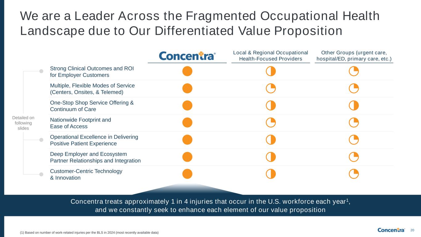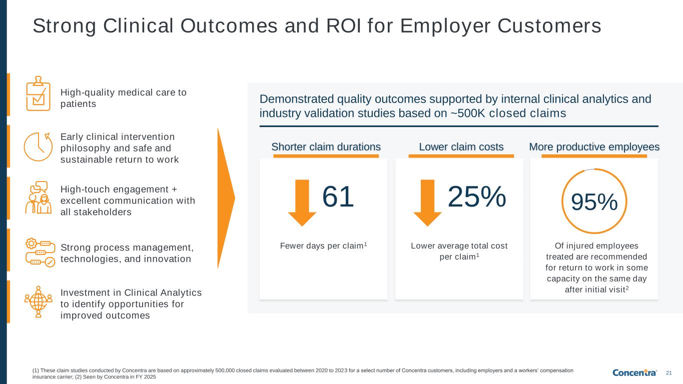 20 We are a Leader Across the Fragmented Occupational Health Landscape due to Our Differentiated Value Proposition Local & Regional Occupational Health-Focused Providers Other Groups (urgent care, hospital/ED, primary care, etc.) Strong Clinical Outcomes and ROI for Employer Customers Multiple, Flexible Modes of Service (Centers, Onsites, & Telemed) One-Stop Shop Service Offering & Continuum of Care Nationwide Footprint and Ease of Access Operational Excellence in Delivering Positive Patient Experience Deep Employer and Ecosystem Partner Relationships and Integration Customer-Centric Technology & Innovation Concentra treats approximately 1 in 4 injuries that occur in the U.S. workforce each year1, and we constantly seek to enhance each element of our value proposition Detailed on following slides (1) Based on number of work-related injuries per the BLS in 2024 (most recently available data)