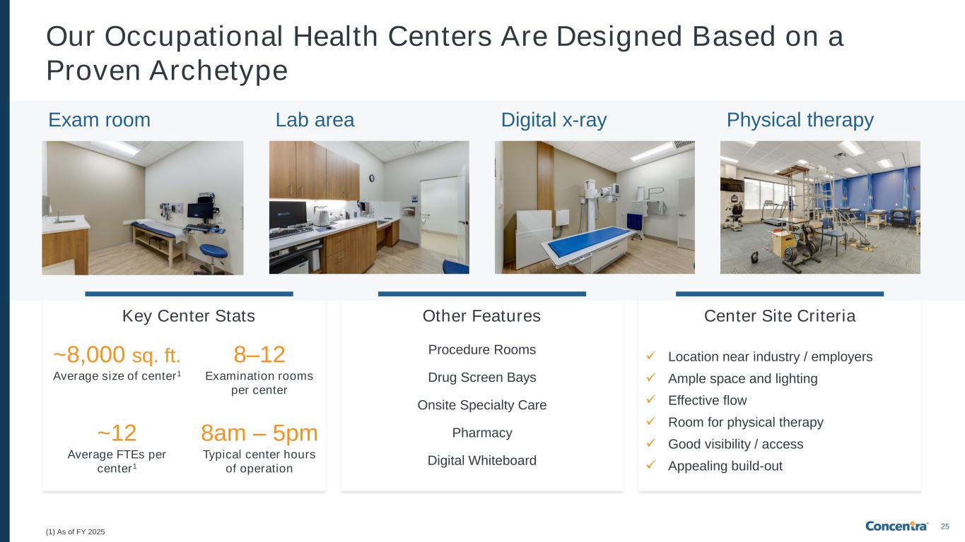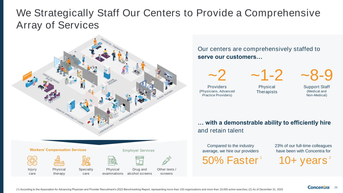 25 ~8,000 sq. ft. Average size of center1 ~12 Average FTEs per center1 8–12 Examination rooms per center Procedure Rooms Drug Screen Bays Onsite Specialty Care Pharmacy Digital Whiteboard Key Center Stats Other Features Exam room Lab area Digital x-ray Physical therapy Center Site Criteria ✓ Location near industry / employers ✓ Ample space and lighting ✓ Effective flow ✓ Room for physical therapy ✓ Good visibility / access ✓ Appealing build-out (1) As of FY 2025 8am – 5pm Typical center hours of operation Our Occupational Health Centers Are Designed Based on a Proven Archetype