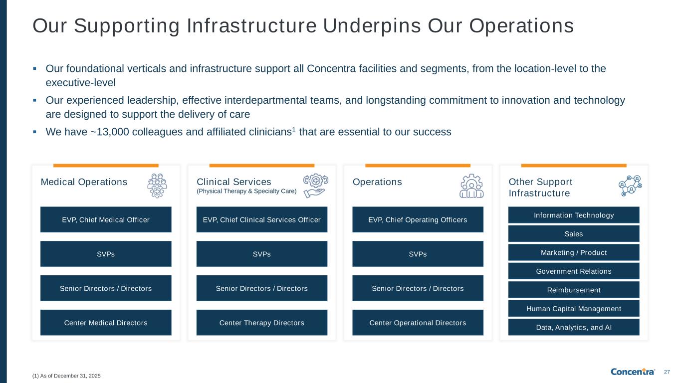 26 (1) According to the Association for Advancing Physician and Provider Recruitment’s 2023 Benchmarking Report, representing more than 150 organizations and more than 19,000 active searches; (2) As of December 31, 2025 Injury care Physical therapy Physical examinations Other tests / screens Drug and alcohol screens Specialty care Workers’ Compensation Services Employer Services ~2 Providers (Physicians, Advanced Practice Providers) ~1-2 Physical Therapists ~8-9 Support Staff (Medical and Non-Medical) Our centers are comprehensively staffed to serve our customers… 23% of our full-time colleagues have been with Concentra for 10+ years Compared to the industry average, we hire our providers 50% Faster … with a demonstrable ability to efficiently hire and retain talent 1 2 We Strategically Staff Our Centers to Provide a Comprehensive Array of Services
