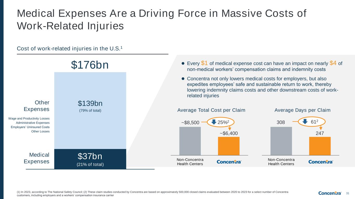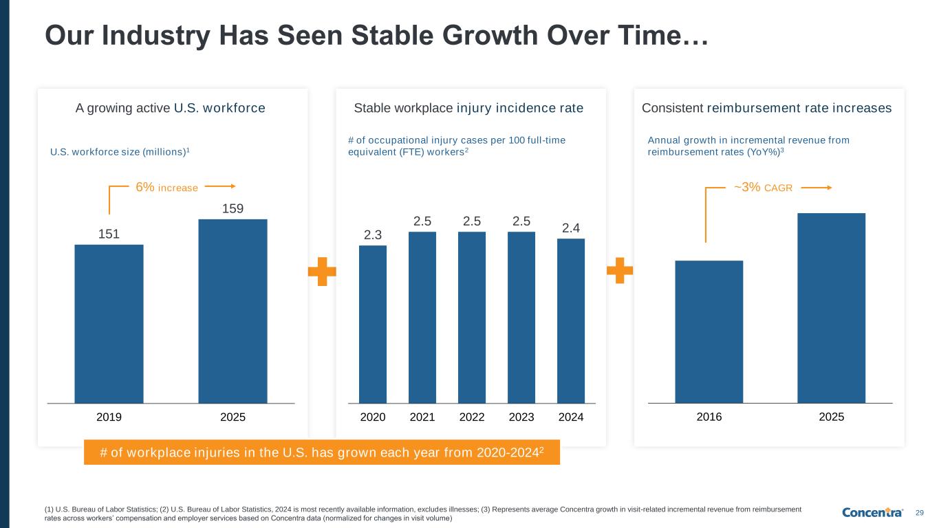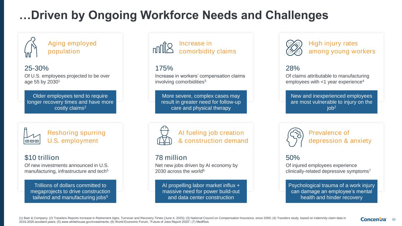 29 Our Industry Has Seen Stable Growth Over Time… Stable workplace injury incidence rate (1) U.S. Bureau of Labor Statistics; (2) U.S. Bureau of Labor Statistics, 2024 is most recently available information, excludes illnesses; (3) Represents average Concentra growth in visit-related incremental revenue from reimbursement rates across workers’ compensation and employer services based on Concentra data (normalized for changes in visit volume) Consistent reimbursement rate increasesA growing active U.S. workforce 151 159 2019 2025 6% increase 2016 2025 ~3% CAGR U.S. workforce size (millions)1 # of occupational injury cases per 100 full-time equivalent (FTE) workers2 Annual growth in incremental revenue from reimbursement rates (YoY%)3 2.3 2.5 2.5 2.5 2.4 2020 2021 2022 2023 2024 # of workplace injuries in the U.S. has grown each year from 2020-20242