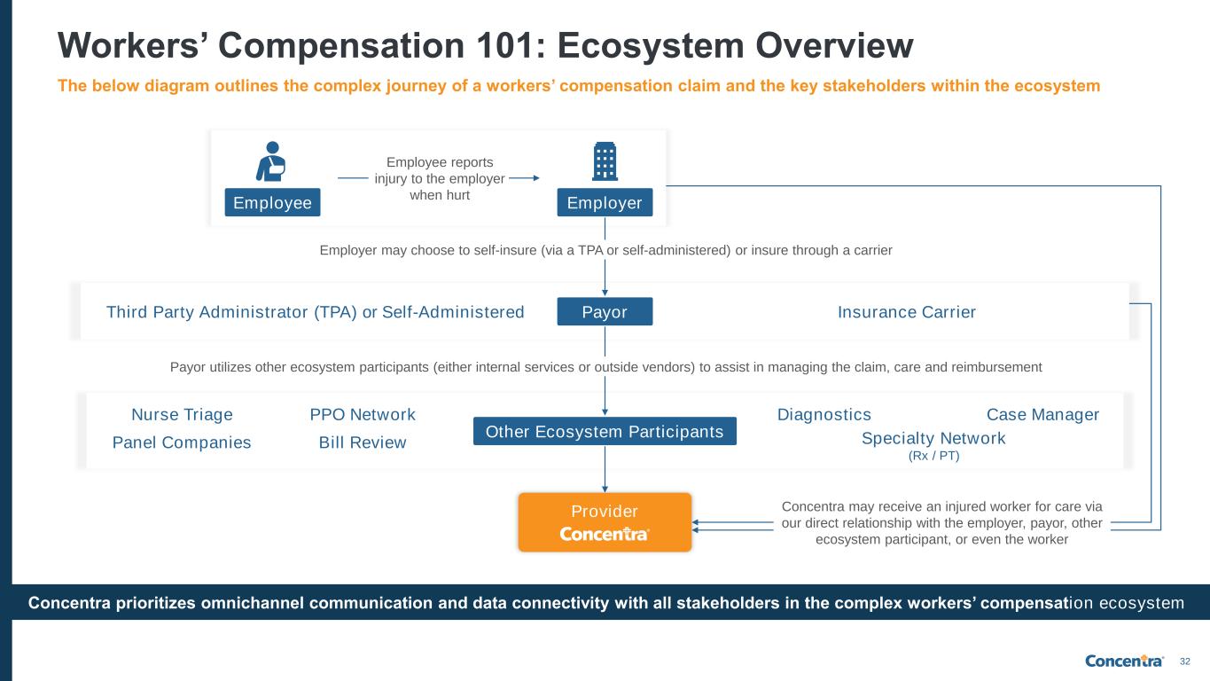 31 Medical Expenses Are a Driving Force in Massive Costs of Work-Related Injuries ⚫ Every $1 of medical expense cost can have an impact on nearly $4 of non-medical workers’ compensation claims and indemnity costs ⚫ Concentra not only lowers medical costs for employers, but also expedites employees’ safe and sustainable return to work, thereby lowering indemnity claims costs and other downstream costs of work- related injuries $176bn Cost of work-related injuries in the U.S.1 $139bn (79% of total) $37bn (21% of total) Medical Expenses Other Expenses Wage and Productivity Losses Administrative Expenses Employers’ Uninsured Costs Other Losses Non-Concentra Health Centers Average Total Cost per Claim ~$8,500 ~$6,400 25%2 Non-Concentra Health Centers Average Days per Claim 612308 247 (1) In 2023, according to The National Safety Council; (2) These claim studies conducted by Concentra are based on approximately 500,000 closed claims evaluated between 2020 to 2023 for a select number of Concentra customers, including employers and a workers’ compensation insurance carrier