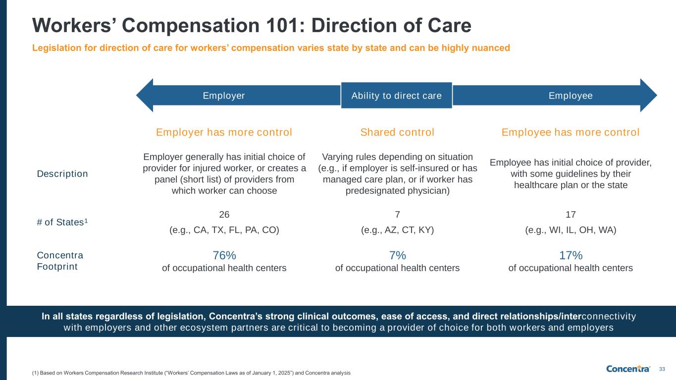 32 Workers’ Compensation 101: Ecosystem Overview The below diagram outlines the complex journey of a workers’ compensation claim and the key stakeholders within the ecosystem Concentra prioritizes omnichannel communication and data connectivity with all stakeholders in the complex workers’ compensation ecosystem Employee reports injury to the employer when hurt Employee Employer PayorThird Party Administrator (TPA) or Self-Administered Insurance Carrier Other Ecosystem Participants Employer may choose to self-insure (via a TPA or self-administered) or insure through a carrier Bill Review Specialty Network (Rx / PT) Case ManagerNurse Triage PPO Network Diagnostics Provider Payor utilizes other ecosystem participants (either internal services or outside vendors) to assist in managing the claim, care and reimbursement Concentra may receive an injured worker for care via our direct relationship with the employer, payor, other ecosystem participant, or even the worker Panel Companies