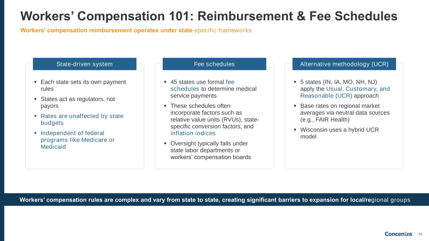 33 Workers’ Compensation 101: Direction of Care Legislation for direction of care for workers’ compensation varies state by state and can be highly nuanced Employer has more control Shared control Employee has more control Description Employer generally has initial choice of provider for injured worker, or creates a panel (short list) of providers from which worker can choose Varying rules depending on situation (e.g., if employer is self-insured or has managed care plan, or if worker has predesignated physician) Employee has initial choice of provider, with some guidelines by their healthcare plan or the state # of States1 26 (e.g., CA, TX, FL, PA, CO) 7 (e.g., AZ, CT, KY) 17 (e.g., WI, IL, OH, WA) Concentra Footprint 76% of occupational health centers 7% of occupational health centers 17% of occupational health centers Ability to direct careEmployer Employee (1) Based on Workers Compensation Research Institute (“Workers’ Compensation Laws as of January 1, 2025”) and Concentra analysis In all states regardless of legislation, Concentra’s strong clinical outcomes, ease of access, and direct relationships/interconnectivity with employers and other ecosystem partners are critical to becoming a provider of choice for both workers and employers