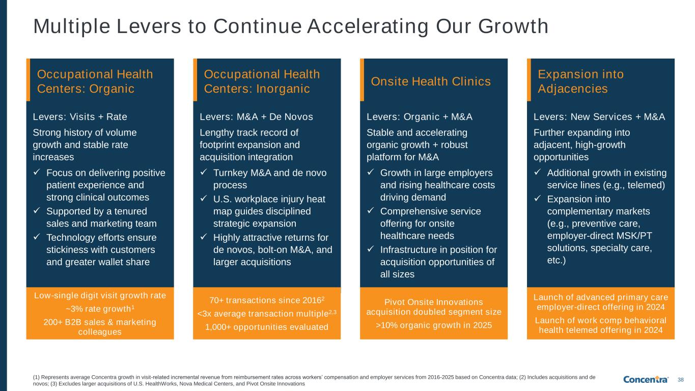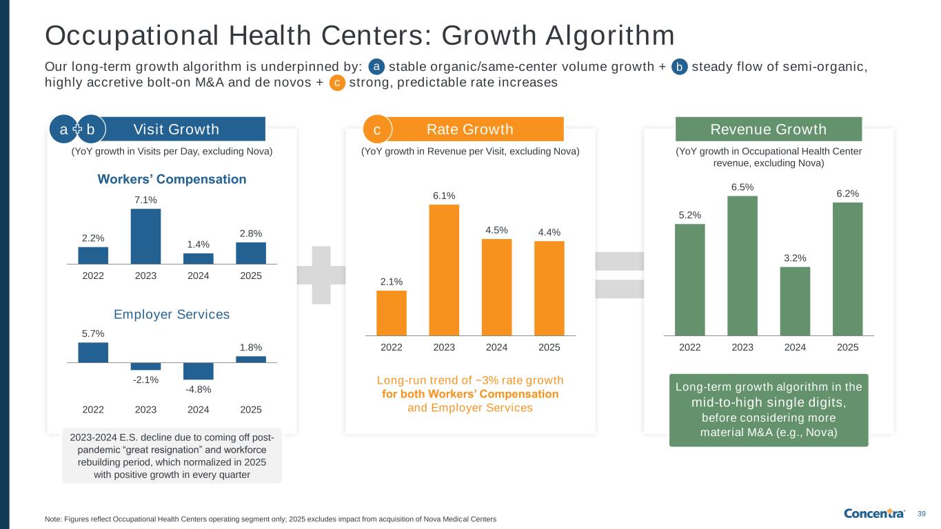 38 Multiple Levers to Continue Accelerating Our Growth (1) Represents average Concentra growth in visit-related incremental revenue from reimbursement rates across workers’ compensation and employer services from 2016-2025 based on Concentra data; (2) Includes acquisitions and de novos; (3) Excludes larger acquisitions of U.S. HealthWorks, Nova Medical Centers, and Pivot Onsite Innovations Levers: M&A + De Novos Lengthy track record of footprint expansion and acquisition integration ✓ Turnkey M&A and de novo process ✓ U.S. workplace injury heat map guides disciplined strategic expansion ✓ Highly attractive returns for de novos, bolt-on M&A, and larger acquisitions Occupational Health Centers: Inorganic Levers: Visits + Rate Strong history of volume growth and stable rate increases ✓ Focus on delivering positive patient experience and strong clinical outcomes ✓ Supported by a tenured sales and marketing team ✓ Technology efforts ensure stickiness with customers and greater wallet share Occupational Health Centers: Organic Levers: Organic + M&A Stable and accelerating organic growth + robust platform for M&A ✓ Growth in large employers and rising healthcare costs driving demand ✓ Comprehensive service offering for onsite healthcare needs ✓ Infrastructure in position for acquisition opportunities of all sizes Onsite Health Clinics Levers: New Services + M&A Further expanding into adjacent, high-growth opportunities ✓ Additional growth in existing service lines (e.g., telemed) ✓ Expansion into complementary markets (e.g., preventive care, employer-direct MSK/PT solutions, specialty care, etc.) Expansion into Adjacencies 70+ transactions since 20162 <3x average transaction multiple2,3 1,000+ opportunities evaluated Low-single digit visit growth rate ~3% rate growth1 200+ B2B sales & marketing colleagues Pivot Onsite Innovations acquisition doubled segment size >10% organic growth in 2025 Launch of advanced primary care employer-direct offering in 2024 Launch of work comp behavioral health telemed offering in 2024