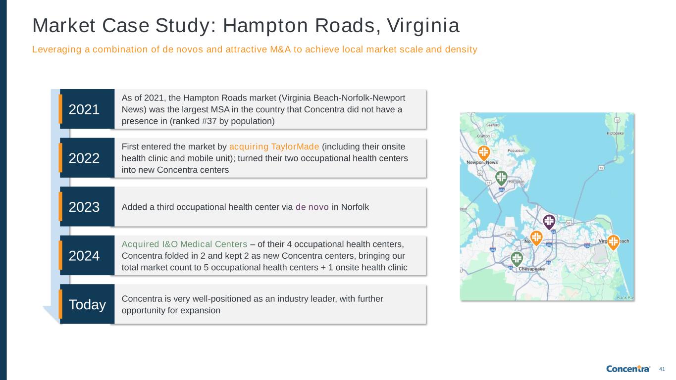 40 Occupational Health Centers: Acquisitions & De Novos TX MT CA ID NV AZ OR IL NM CO WY MN SD IA ND UT KS NE WA WI OK MI MO NY PA FL IN AL GA AR LA NC VA TN KY OH MS ME SC MI WV VT NH MA CT NJ MD DE RI AK HI 3 to 15 15 to 100 Total potential clinic opportunities per state Significant geographic expansion opportunities for 500+ additional occupational health centers, informed by our sophisticated market analysis processes Acquisitions De Novos 45+ acquisitions since 2016 1,000+ opportunities evaluated <3x avg. EBITDA multiple1 (1) Excludes acquisitions of U.S. HealthWorks, Nova Medical Centers, and Pivot Onsite Innovations; (2) Logos denote representative practices acquired by Concentra since 2016 ~25 de novos since 2016 250+ opportunities in funnel <3x avg. EBITDA multiple Wide variety of targets acquired2 and opportunities available: ✓ National / regional groups ✓ Local, independent practices ✓ Hospital-owned clinics ✓ Occmed carve-out from urgent care Various strategies where de novos enhance the Concentra footprint: ✓ Fill gap in existing market ✓ Extend existing market coverage ✓ Enter new market (often 2+ sites) (e.g., Katy/Houston, TX)(e.g., Hialeah/Miami, FL) (e.g., Fort Myers, FL) Concentra acquisitions and de novos ramp quickly due to (1) deployment of existing local/regional/national employer customer and ecosystem partner relationships, (2) addition of new services, and (3) leveraging corporate resources and economies of scale (Bolingbrook, IL)