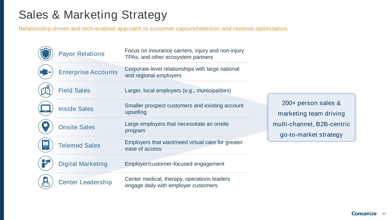41 Market Case Study: Hampton Roads, Virginia Leveraging a combination of de novos and attractive M&A to achieve local market scale and density First entered the market by acquiring TaylorMade (including their onsite health clinic and mobile unit); turned their two occupational health centers into new Concentra centers Added a third occupational health center via de novo in Norfolk Acquired I&O Medical Centers – of their 4 occupational health centers, Concentra folded in 2 and kept 2 as new Concentra centers, bringing our total market count to 5 occupational health centers + 1 onsite health clinic As of 2021, the Hampton Roads market (Virginia Beach-Norfolk-Newport News) was the largest MSA in the country that Concentra did not have a presence in (ranked #37 by population) Concentra is very well-positioned as an industry leader, with further opportunity for expansion 2021 2022 2023 2024 Today