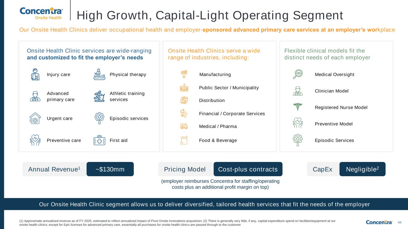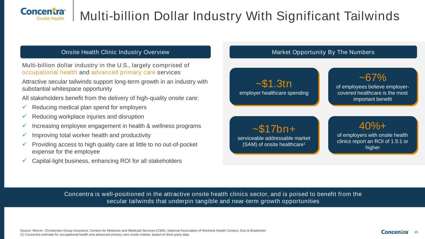 44 High Growth, Capital-Light Operating Segment Preventive care Injury care Physical therapy Advanced primary care Athletic training services Urgent care Episodic services First aid Medical Oversight Clinician Model Registered Nurse Model Preventive Model Episodic Services Onsite Health Clinic services are wide-ranging and customized to fit the employer’s needs Onsite Health Clinics serve a wide range of industries, including: Flexible clinical models fit the distinct needs of each employer Manufacturing (1) Approximate annualized revenue as of FY 2025, estimated to reflect annualized impact of Pivot Onsite Innovations acquisit ion; (2) There is generally very little, if any, capital expenditure spend on facilities/equipment at our onsite health clinics; except for Epic licenses for advanced primary care, essentially all purchases for onsite health clinics are passed through to the customer Our Onsite Health Clinics deliver occupational health and employer-sponsored advanced primary care services at an employer’s workplace Our Onsite Health Clinic segment allows us to deliver diversified, tailored health services that fit the needs of the employer Public Sector / Municipality Distribution Financial / Corporate Services Medical / Pharma Food & Beverage Annual Revenue1 ~$130mm Pricing Model Cost-plus contracts CapEx Negligible2 (employer reimburses Concentra for staffing/operating costs plus an additional profit margin on top)