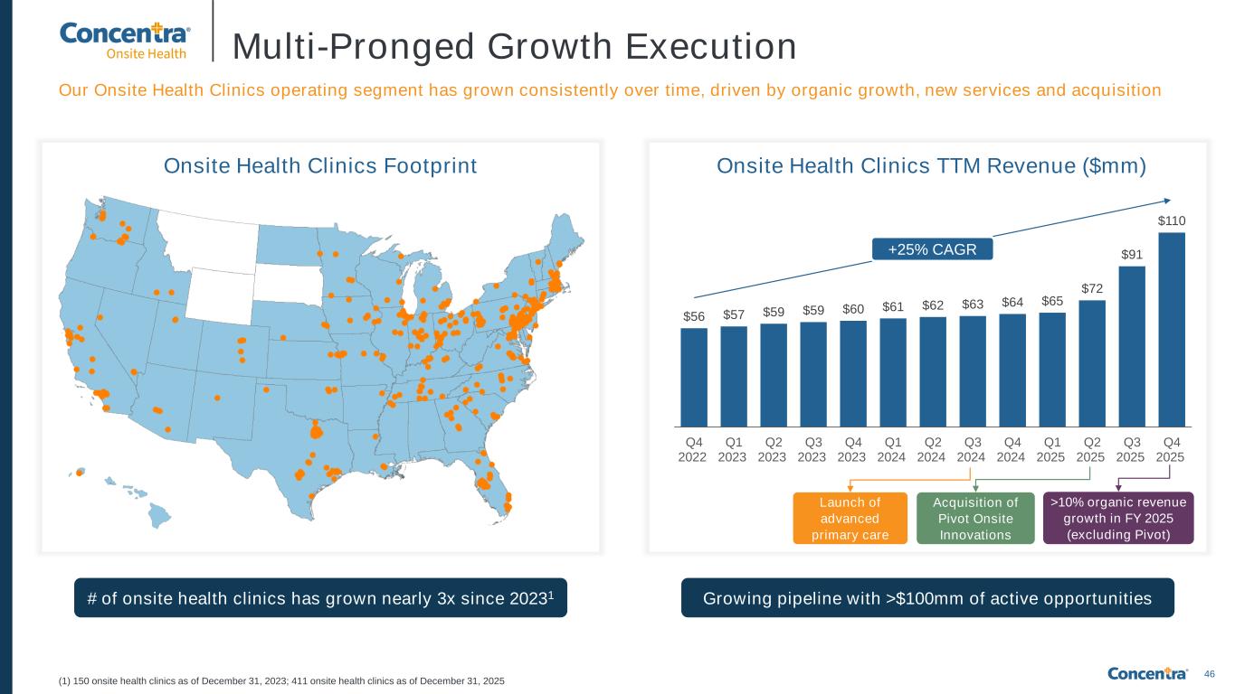 45 Multi-billion Dollar Industry With Significant Tailwinds Source: Mercer, Christensen Group Insurance, Centers for Medicare and Medicaid Services (CMS), National Association of Worksite Health Centers, Dun & Bradstreet (1) Concentra estimate for occupational health and advanced primary care onsite market, based on third-party data Onsite Health Clinic Industry Overview Multi-billion dollar industry in the U.S., largely comprised of occupational health and advanced primary care services Attractive secular tailwinds support long-term growth in an industry with substantial whitespace opportunity All stakeholders benefit from the delivery of high-quality onsite care: ✓ Reducing medical plan spend for employers ✓ Reducing workplace injuries and disruption ✓ Increasing employee engagement in health & wellness programs ✓ Improving total worker health and productivity ✓ Providing access to high quality care at little to no out-of-pocket expense for the employee ✓ Capital-light business, enhancing ROI for all stakeholders Market Opportunity By The Numbers ~$1.3tn employer healthcare spending 40%+ of employers with onsite health clinics report an ROI of 1.5:1 or higher ~$17bn+ serviceable addressable market (SAM) of onsite healthcare1 ~67% of employees believe employer- covered healthcare is the most important benefit Concentra is well-positioned in the attractive onsite health clinics sector, and is poised to benefit from the secular tailwinds that underpin tangible and near-term growth opportunities