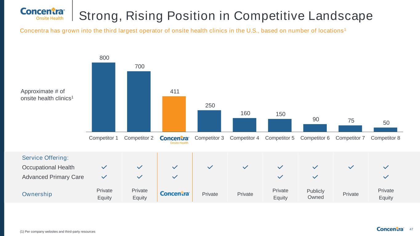 47 Strong, Rising Position in Competitive Landscape (1) Per company websites and third-party resources 800 700 411 250 160 150 90 75 50 Competitor 1 Competitor 2 Competitor 3 Competitor 4 Competitor 5 Competitor 6 Competitor 7 Competitor 8 Approximate # of onsite health clinics1 Service Offering: Occupational Health Advanced Primary Care Ownership Private Equity Private Equity Private Private Private Equity Publicly Owned Private Private Equity Concentra has grown into the third largest operator of onsite health clinics in the U.S., based on number of locations1