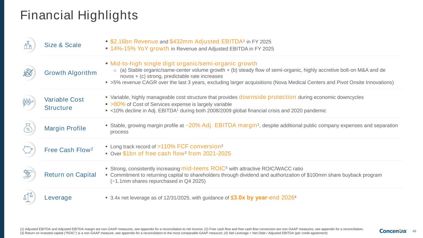 49 Financial Highlights Size & Scale ▪ $2.16bn Revenue and $432mm Adjusted EBITDA1 in FY 2025 ▪ 14%-15% YoY growth in Revenue and Adjusted EBITDA in FY 2025 Growth Algorithm ▪ Mid-to-high single digit organic/semi-organic growth o (a) Stable organic/same-center volume growth + (b) steady flow of semi-organic, highly accretive bolt-on M&A and de novos + (c) strong, predictable rate increases ▪ >5% revenue CAGR over the last 3 years, excluding larger acquisitions (Nova Medical Centers and Pivot Onsite Innovations) Variable Cost Structure ▪ Variable, highly manageable cost structure that provides downside protection during economic downcycles ▪ >80% of Cost of Services expense is largely variable ▪ <10% decline in Adj. EBITDA1 during both 2008/2009 global financial crisis and 2020 pandemic Margin Profile ▪ Stable, growing margin profile at ~20% Adj. EBITDA margin1, despite additional public company expenses and separation process Free Cash Flow2 ▪ Long track record of >110% FCF conversion2 ▪ Over $1bn of free cash flow2 from 2021-2025 Return on Capital ▪ Strong, consistently increasing mid-teens ROIC3 with attractive ROIC/WACC ratio ▪ Commitment to returning capital to shareholders through dividend and authorization of $100mm share buyback program (~1.1mm shares repurchased in Q4 2025) Leverage ▪ 3.4x net leverage as of 12/31/2025, with guidance of ≤3.0x by year-end 20264 (1) Adjusted EBITDA and Adjusted EBITDA margin are non-GAAP measures, see appendix for a reconciliation to net income; (2) Free cash flow and free cash flow conversion are non-GAAP measures, see appendix for a reconciliation; (3) Return on invested capital ("ROIC") is a non-GAAP measure, see appendix for a reconciliation to the most comparable GAAP measure; (4) Net Leverage = Net Debt / Adjusted EBITDA (per credit agreement)