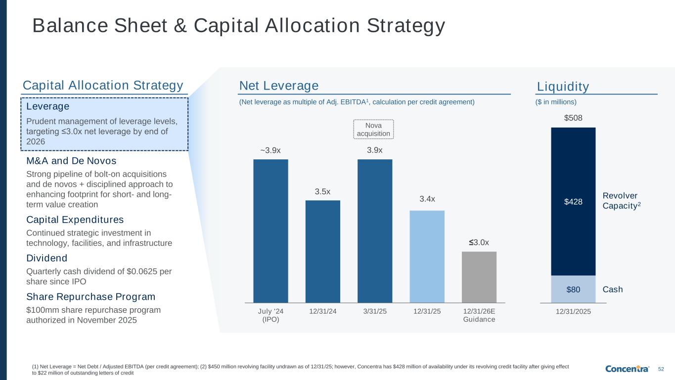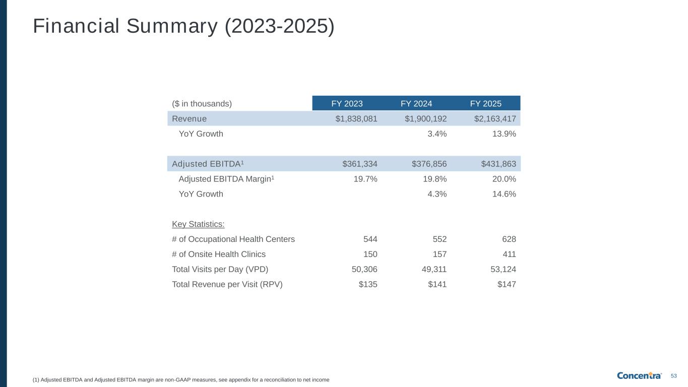 52 Leverage Prudent management of leverage levels, targeting ≤3.0x net leverage by end of 2026 M&A and De Novos Strong pipeline of bolt-on acquisitions and de novos + disciplined approach to enhancing footprint for short- and long- term value creation Capital Expenditures Continued strategic investment in technology, facilities, and infrastructure Dividend Quarterly cash dividend of $0.0625 per share since IPO Share Repurchase Program $100mm share repurchase program authorized in November 2025 Net Leverage Liquidity $80 $428 $508 12/31/2025 Cash Revolver Capacity2 ($ in millions) Capital Allocation Strategy (Net leverage as multiple of Adj. EBITDA1, calculation per credit agreement) ~3.9x 3.5x 3.9x 3.4x ≤3.0x July '24 (IPO) 12/31/24 3/31/25 12/31/25 12/31/26E Guidance Nova acquisition (1) Net Leverage = Net Debt / Adjusted EBITDA (per credit agreement); (2) $450 million revolving facility undrawn as of 12/31/25; however, Concentra has $428 million of availability under its revolving credit facility after giving effect to $22 million of outstanding letters of credit Balance Sheet & Capital Allocation Strategy