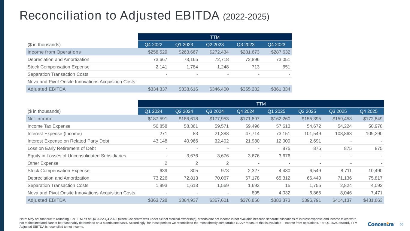 55 Reconciliation to Adjusted EBITDA (2022-2025) TTM ($ in thousands) Q4 2022 Q1 2023 Q2 2023 Q3 2023 Q4 2023 Income from Operations $258,529 $263,667 $272,434 $281,673 $287,632 Depreciation and Amortization 73,667 73,165 72,718 72,896 73,051 Stock Compensation Expense 2,141 1,784 1,248 713 651 Separation Transaction Costs - - - - - Nova and Pivot Onsite Innovations Acquisition Costs - - - - - Adjusted EBITDA $334,337 $338,616 $346,400 $355,282 $361,334 TTM ($ in thousands) Q1 2024 Q2 2024 Q3 2024 Q4 2024 Q1 2025 Q2 2025 Q3 2025 Q4 2025 Net Income $187,591 $186,618 $177,953 $171,897 $162,260 $155,395 $159,458 $172,849 Income Tax Expense 56,858 58,361 59,571 59,496 57,613 54,672 54,224 50,978 Interest Expense (Income) 271 83 21,388 47,714 73,151 101,549 108,863 109,290 Interest Expense on Related Party Debt 43,148 40,966 32,402 21,980 12,009 2,691 - - Loss on Early Retirement of Debt - - - - 875 875 875 875 Equity in Losses of Unconsolidated Subsidiaries - 3,676 3,676 3,676 3,676 - - - Other Expense 2 2 2 - - - - - Stock Compensation Expense 639 805 973 2,327 4,430 6,549 8,711 10,490 Depreciation and Amortization 73,226 72,813 70,067 67,178 65,312 66,440 71,136 75,817 Separation Transaction Costs 1,993 1,613 1,569 1,693 15 1,755 2,824 4,093 Nova and Pivot Onsite Innovations Acquisition Costs - - - 895 4,032 6,865 8,046 7,471 Adjusted EBITDA $363,728 $364,937 $367,601 $376,856 $383,373 $396,791 $414,137 $431,863 Note: May not foot due to rounding. For TTM as of Q4 2022-Q4 2023 (when Concentra was under Select Medical ownership), standalone net income is not available because separate allocations of interest expense and income taxes were not maintained and cannot be reasonably determined on a standalone basis. Accordingly, for those periods we reconcile to the most directly comparable GAAP measure that is available—income from operations. For Q1 2024 onward, TTM Adjusted EBITDA is reconciled to net income.