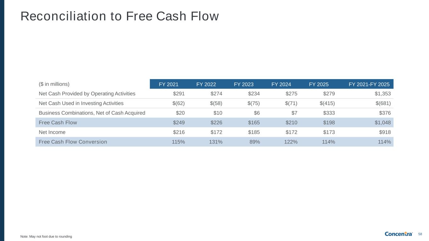 58 Reconciliation to Free Cash Flow Note: May not foot due to rounding ($ in millions) FY 2021 FY 2022 FY 2023 FY 2024 FY 2025 FY 2021-FY 2025 Net Cash Provided by Operating Activities $291 $274 $234 $275 $279 $1,353 Net Cash Used in Investing Activities $(62) $(58) $(75) $(71) $(415) $(681) Business Combinations, Net of Cash Acquired $20 $10 $6 $7 $333 $376 Free Cash Flow $249 $226 $165 $210 $198 $1,048 Net Income $216 $172 $185 $172 $173 $918 Free Cash Flow Conversion 115% 131% 89% 122% 114% 114%