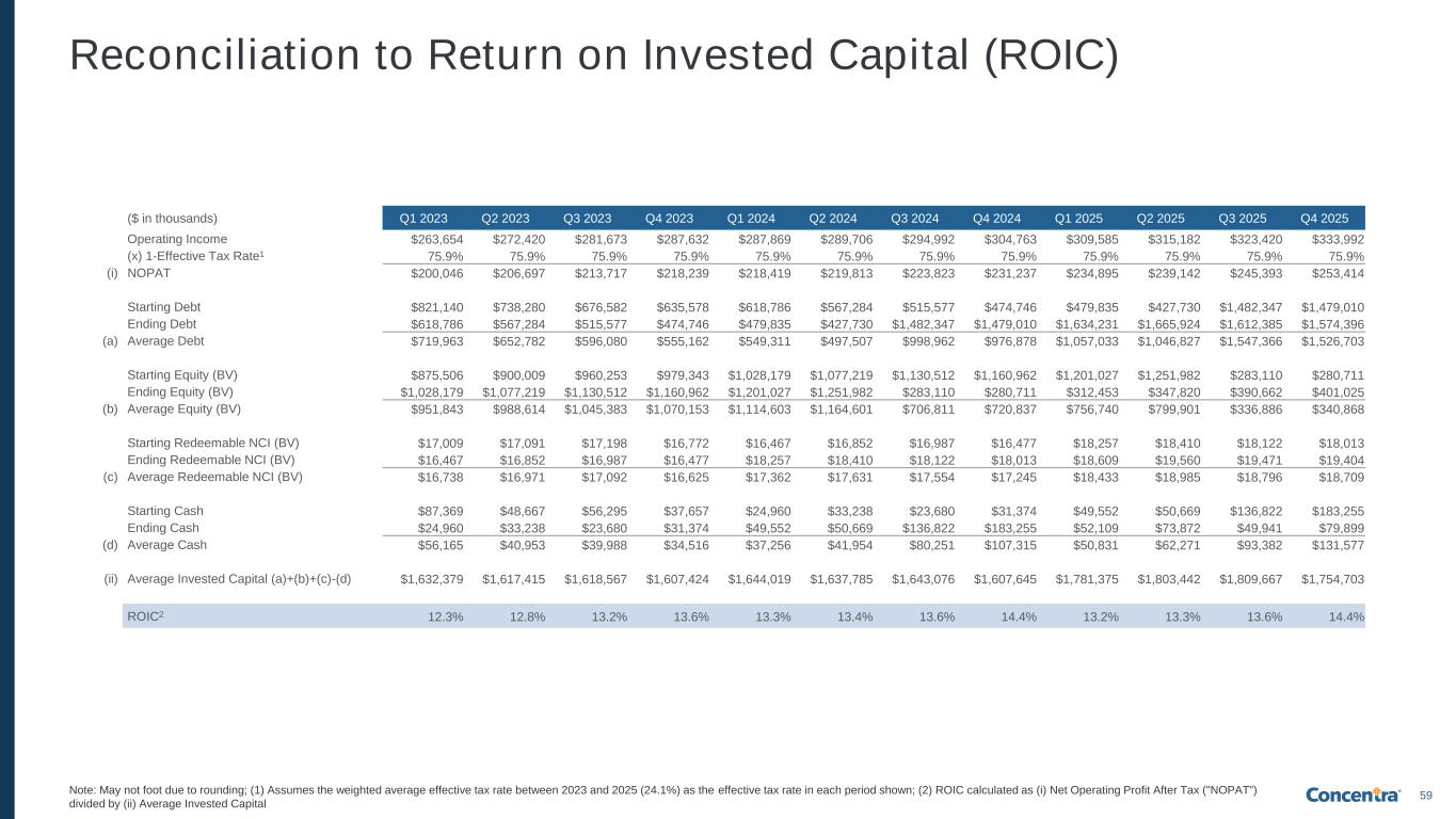59 Reconciliation to Return on Invested Capital (ROIC) Note: May not foot due to rounding; (1) Assumes the weighted average effective tax rate between 2023 and 2025 (24.1%) as the effective tax rate in each period shown; (2) ROIC calculated as (i) Net Operating Profit After Tax ("NOPAT") divided by (ii) Average Invested Capital ($ in thousands) Q1 2023 Q2 2023 Q3 2023 Q4 2023 Q1 2024 Q2 2024 Q3 2024 Q4 2024 Q1 2025 Q2 2025 Q3 2025 Q4 2025 Operating Income $263,654 $272,420 $281,673 $287,632 $287,869 $289,706 $294,992 $304,763 $309,585 $315,182 $323,420 $333,992 (x) 1-Effective Tax Rate1 75.9% 75.9% 75.9% 75.9% 75.9% 75.9% 75.9% 75.9% 75.9% 75.9% 75.9% 75.9% (i) NOPAT $200,046 $206,697 $213,717 $218,239 $218,419 $219,813 $223,823 $231,237 $234,895 $239,142 $245,393 $253,414 Starting Debt $821,140 $738,280 $676,582 $635,578 $618,786 $567,284 $515,577 $474,746 $479,835 $427,730 $1,482,347 $1,479,010 Ending Debt $618,786 $567,284 $515,577 $474,746 $479,835 $427,730 $1,482,347 $1,479,010 $1,634,231 $1,665,924 $1,612,385 $1,574,396 (a) Average Debt $719,963 $652,782 $596,080 $555,162 $549,311 $497,507 $998,962 $976,878 $1,057,033 $1,046,827 $1,547,366 $1,526,703 Starting Equity (BV) $875,506 $900,009 $960,253 $979,343 $1,028,179 $1,077,219 $1,130,512 $1,160,962 $1,201,027 $1,251,982 $283,110 $280,711 Ending Equity (BV) $1,028,179 $1,077,219 $1,130,512 $1,160,962 $1,201,027 $1,251,982 $283,110 $280,711 $312,453 $347,820 $390,662 $401,025 (b) Average Equity (BV) $951,843 $988,614 $1,045,383 $1,070,153 $1,114,603 $1,164,601 $706,811 $720,837 $756,740 $799,901 $336,886 $340,868 Starting Redeemable NCI (BV) $17,009 $17,091 $17,198 $16,772 $16,467 $16,852 $16,987 $16,477 $18,257 $18,410 $18,122 $18,013 Ending Redeemable NCI (BV) $16,467 $16,852 $16,987 $16,477 $18,257 $18,410 $18,122 $18,013 $18,609 $19,560 $19,471 $19,404 (c) Average Redeemable NCI (BV) $16,738 $16,971 $17,092 $16,625 $17,362 $17,631 $17,554 $17,245 $18,433 $18,985 $18,796 $18,709 Starting Cash $87,369 $48,667 $56,295 $37,657 $24,960 $33,238 $23,680 $31,374 $49,552 $50,669 $136,822 $183,255 Ending Cash $24,960 $33,238 $23,680 $31,374 $49,552 $50,669 $136,822 $183,255 $52,109 $73,872 $49,941 $79,899 (d) Average Cash $56,165 $40,953 $39,988 $34,516 $37,256 $41,954 $80,251 $107,315 $50,831 $62,271 $93,382 $131,577 (ii) Average Invested Capital (a)+(b)+(c)-(d) $1,632,379 $1,617,415 $1,618,567 $1,607,424 $1,644,019 $1,637,785 $1,643,076 $1,607,645 $1,781,375 $1,803,442 $1,809,667 $1,754,703 ROIC2 12.3% 12.8% 13.2% 13.6% 13.3% 13.4% 13.6% 14.4% 13.2% 13.3% 13.6% 14.4%